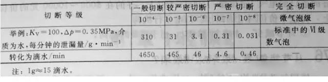 上(shàng)述标準分還(hái)不夠細膩,特别是IV級密封和(hé)V級密封,其洩漏率由10-4突然躍到10-7。為(wèi)此,認為(wèi)應将洩漏标準與切斷的關系進一步細分。切斷的等級與對應的洩漏率見表1-7.