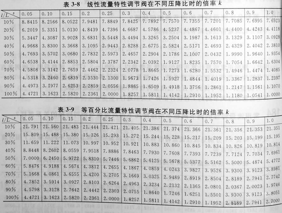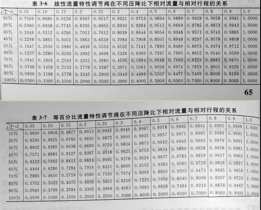 表3-6和(hé)表3-7分别是線性流量特性和(hé)等百分比流量特性調節閥在不同壓降比下相對流量與相對行(xíng)程的關系表。