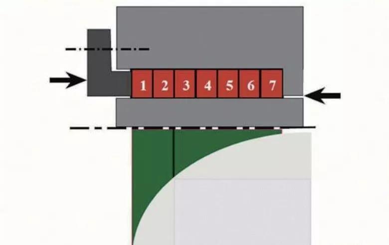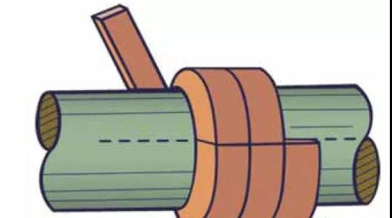 絕不能用繞線圈的方式将盤根材料裝滿填料函,而是用專用切割工具切割盤根編織材料,并制(zhì)成獨立的盤根環,切口呈45º(斜接)(見圖6),這樣可(kě)以利用載荷獲得(de)更好的端面結合。