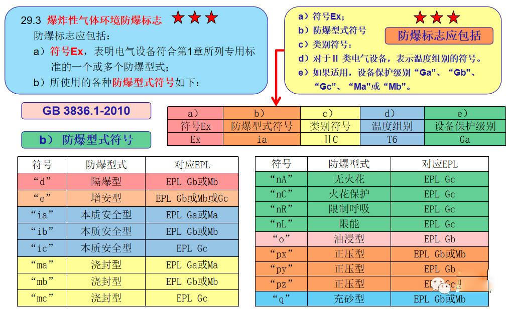 GB 3836.1-2010 爆炸性環境 第1部分:設備 通(tōng)用要求29.14 标志(zhì)示例 易産生(shēng)瓦斯的煤礦用隔爆外殼“d”(EPL Mb):Ex d Ⅰ Mb 或 Ex db Ⅰ。 帶本質型“i”(EPL Ga)輸出電(diàn)路的隔爆外殼Ex元件“d”(EPL Gb),用于除易産生(shēng)煤礦瓦斯氣體(tǐ)外的C級爆炸性氣體(tǐ)環境(防爆合格證編好後加符号“U”):Ex d[ia Ga] ⅡC Gb 或 Ex db [ia] ⅡC。 使用增安型“e”(EPL Gb)和(hé)正壓外殼“px”型(EPL Gb)的電(diàn)氣設備,高(gāo)表面溫度125℃,用于除易産生(shēng)瓦斯的煤礦外的、引燃溫度高(gāo)于125℃的爆炸性氣體(tǐ)環境,在防爆合格證中注明(míng)使用的具體(tǐ)條件(防爆合格證編好後加符号“X”):Ex e px ⅡC 125℃(T4)Gb 或 Ex eb pxb ⅡC 125℃(T4) 使用隔闆外殼“d”(EPL Mb和(hé)Gb)和(hé)增安型“e”(EPL Mb和(hé)Gb)的煤礦用電(diàn)氣設備和(hé)用于除易産生(shēng)瓦斯的煤礦外的B級氣體(tǐ)、引燃溫度高(gāo)于200℃的爆炸性氣體(tǐ)環境:Ex de Ⅰ Mb 或 Ex db eb ⅠEx de ⅡB T3 Gb 或 Ex db eb ⅡB T3 用于除易産生(shēng)瓦斯的煤礦外的、僅存在氨氣爆炸性氣體(tǐ)環境用的隔爆外殼電(diàn)氣設備“d”(EPL Gb):Ex d Ⅱ氨(NH3)Gb 或 Ex db Ⅱ氨(NH3) 用于具有(yǒu)導電(diàn)性粉塵的爆炸性粉塵環境ⅢC等級澆封型電(diàn)氣設備“ma”(EPL Da),高(gāo)表面溫度低(dī)于120℃:Ex ma ⅢC T120℃ Da 或 Ex ma ⅢC T120℃ IP68 用于具有(yǒu)導電(diàn)性粉塵的爆炸性粉塵環境ⅢC等級“ia”(EPL Da)型電(diàn)氣設備,高(gāo)表面溫度低(dī)于120℃:Ex ia ⅢC T120℃ Da 或 Ex ia ⅢC T120℃ IP20 用于具有(yǒu)導電(diàn)性粉塵的爆炸性粉塵環境ⅢC等級“p”(EPL Db)型電(diàn)氣設備,高(gāo)表面溫度低(dī)于120℃:Ex p ⅢC T120℃ Db 或 Ex pb ⅢC T120℃ IP65 用于具有(yǒu)導電(diàn)性粉塵的爆炸性粉塵環境ⅢC等級“t”(EPL Db)型電(diàn)氣設備,高(gāo)表面溫度低(dī)于225℃,當用500mm的粉塵層試驗時(shí)低(dī)于320℃:Ex t ⅢC T225℃ T500 320℃ Db 或 Ex tb ⅢC T225℃ T500 320℃ IP65