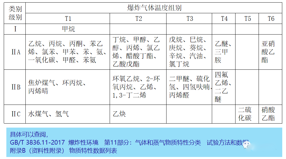 分類、分級、分組:按照氣體(tǐ)/粉塵類型和(hé)特性劃分,防爆電(diàn)氣設備的級别和(hé)組别不應低(dī)于該爆炸性環境內(nèi)可(kě)燃物質的級别和(hé)組别。