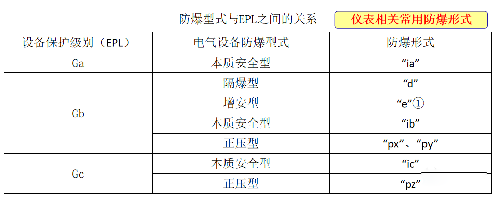 确認電(diàn)氣設備保護級别(EPL)與電(diàn)氣設備防爆型式常用防爆儀表的電(diàn)氣設備保護級别(EPL)與電(diàn)氣設備防爆型式的關系應符合下表:
